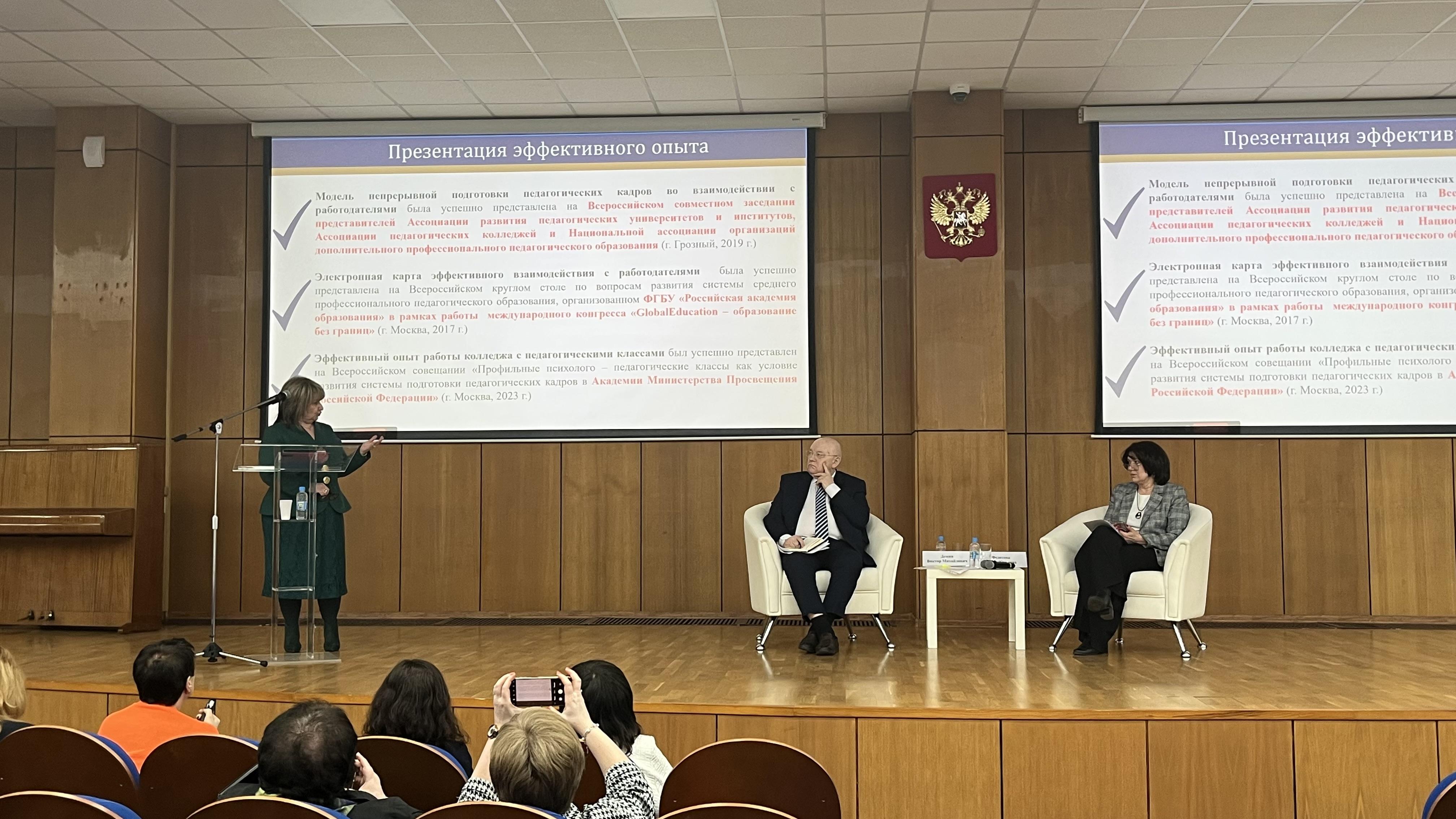 Модераторами сессии выступили заместитель руководителя Центра развития высшего и среднего профессионального образования РАО Виктор Демин и председатель ФУМО СПО, директор Петербургского педагогического колледжа имени Н.А. Некрасова Елена Федотова. Открывая встречу, они подчеркнули насущную необходимость выстраивания бесшовной образовательной траектории «Школа — Колледж — ВУЗ — Работодатель» и формирования нормативных основ для подготовки в системе среднего профессионального образования педагогов основной школы, дефицит которых сегодня ощущается во многих регионах России.